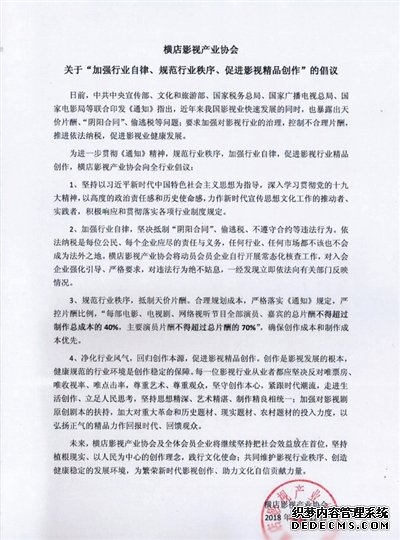 同日首都广播电视节目制功课协会颁发《关于增强行业自律 截止行业不正之风的倡议》。8月12日,以华谊兄弟为会长单元,搜集了博纳影视、横店影视、乐视花儿影视、唐德影视等400余家影视企业的横店影视财富协会也颁发了《关于“增强行业自律、类型行业秩序、促进影视佳构创作”的倡议》。
